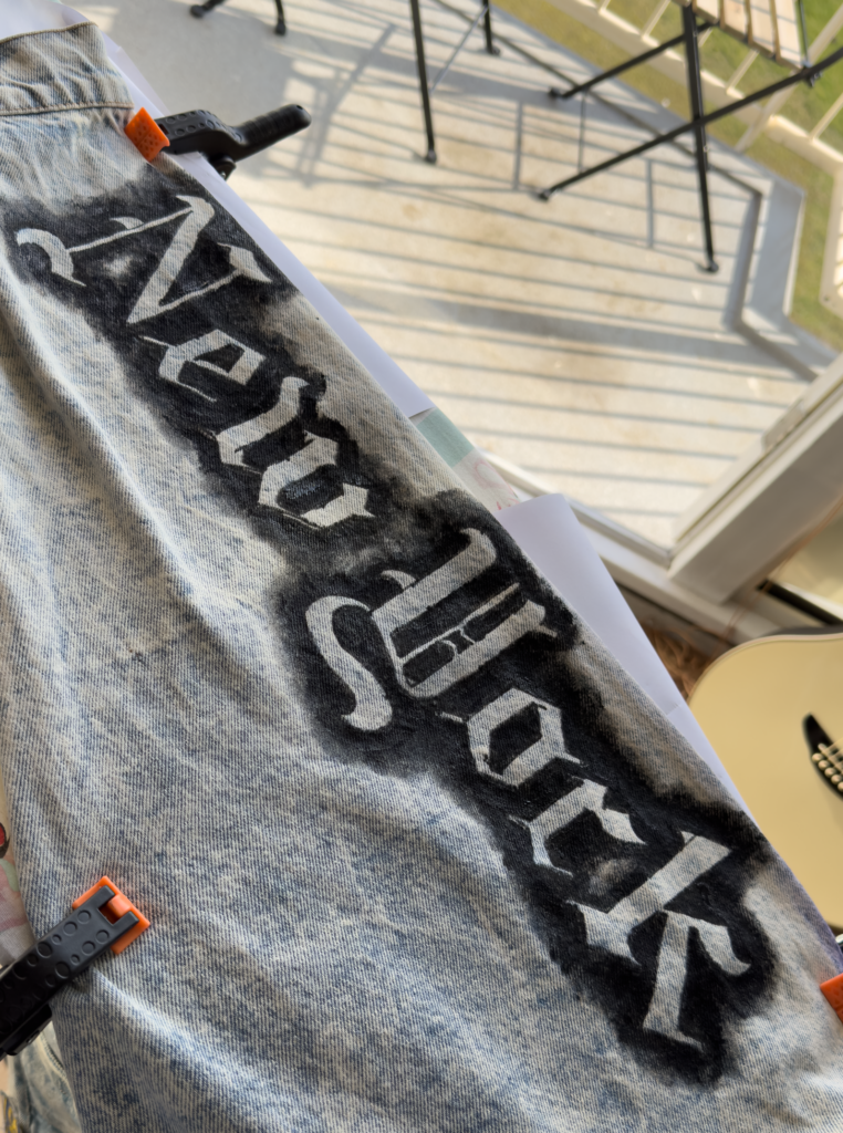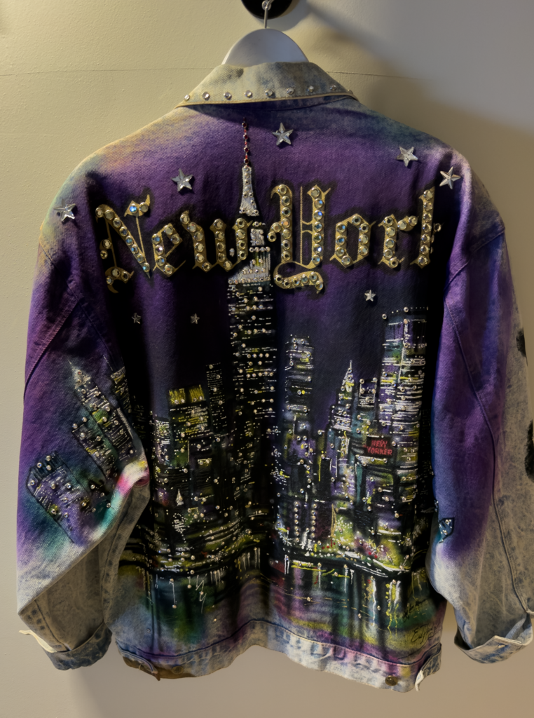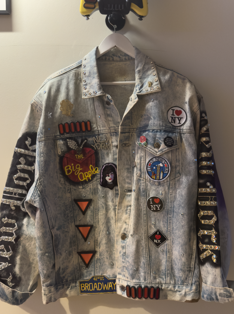 Here I painted the apple on the pocket and sewed on a Broadway patch, which was a hard find. I ended up finding a jacket in Japan with all kinds op patches. So I bought it, took of the Broadway one and threw away the jacket…